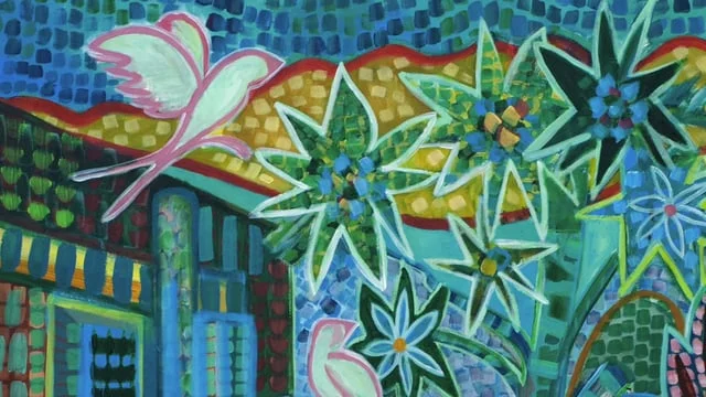 Green grassy field with a tall, round, red-brick tower on the right and a partly cloudy blue sky above.